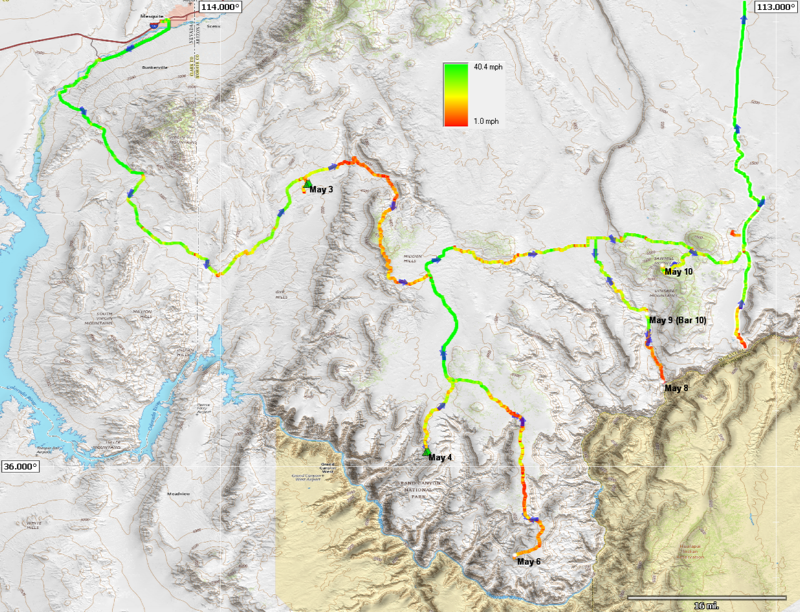 Stops: May 3 Grand Wash Cliffs; May 4-5 Twin Point; May 6-7 Kelly Point; May 8 Whitmore Overlook; May 9 Bar 10 Ranch; May 10 Mount Logan; May 11 Toroweep Overlook