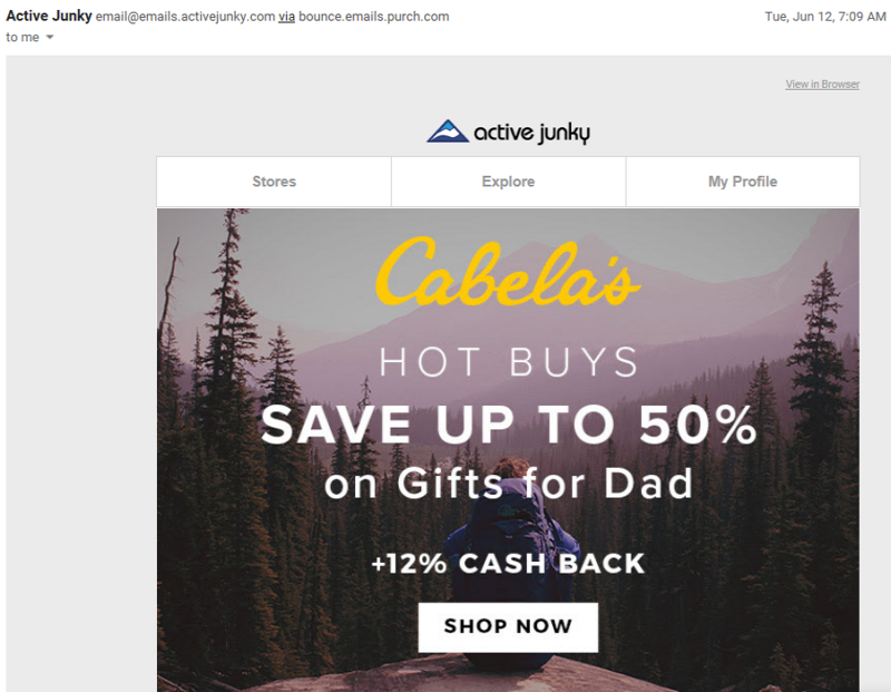 Active Junky sends out en email every day or two with discounts on various vendors' products. For example, this mailing provided 12% back from Cabela's when you "click through" to Cabela's web site to make purchases. Cabela's is featured every few months. Various other vendors are also featured.