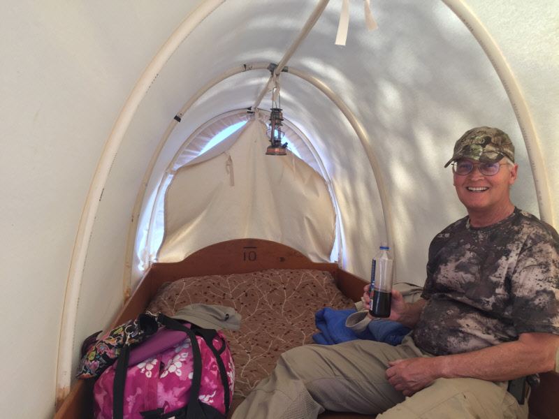 The Bar 10 Ranch is an oasis in the otherwise remote wilderness of the Parashant. It serves as a drop-off point for people who only want to do a shorter river run through the Grand Canyon. Guests arrive at the ranch by air and leave the same way, to be dropped off at water level to board the rafts. We spent one day at the Ranch in their covered wagons. Accommodations included fantastic meals, hot water showers, comfortable lounging areas, and a bit of entertainment after dinner. We had arranged to, and did, in fact, stock up on water as we left. But, the big surprise was that they also were able to sell us gasoline. That little benefit saved a trip to St George for one of our members. All things considered, this was a wonderful opportunity to enjoy some genuine ranch hospitality, cooking and accommodations. If you are anxious to introduce family or friends to a wilderness experience, this is an excellent way to ease them into the camping scene,