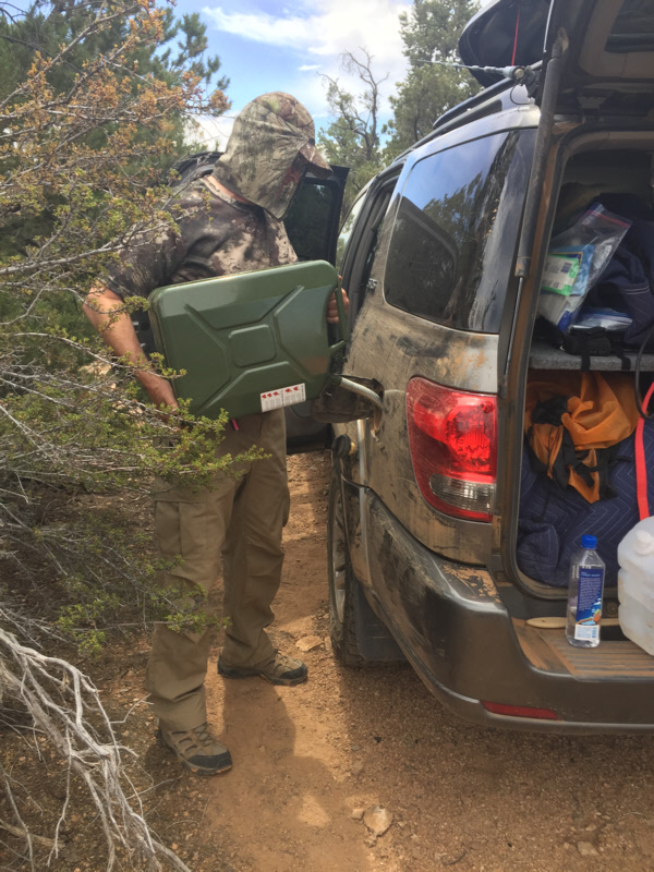 I pulled out the back seat to make room for water and gasoline. Topping off the tank at 22 gallons just before going offroad, almost all 30 gallons of gas were used by the time we made it back to St. George.